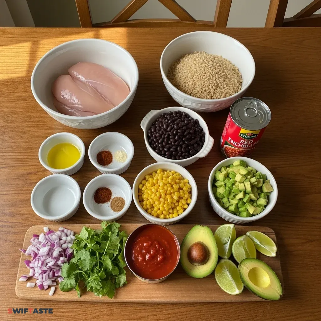 Crafting these amazing High-Protein Chicken Enchilada Bowls starts with quality ingredients. Here’s what we’ll need to create this comforting and nourishing meal:
