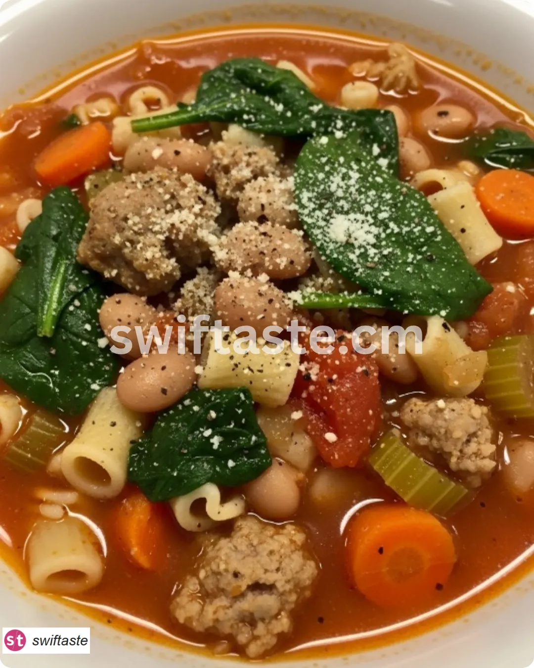 After the soup has simmered for 15 minutes, stir in cooked pasta and fresh spinach. The residual heat will wilt the spinach perfectly. Remove the Parmesan rind if used. Finally, stir in grated Parmesan cheese and season with black pepper to taste.