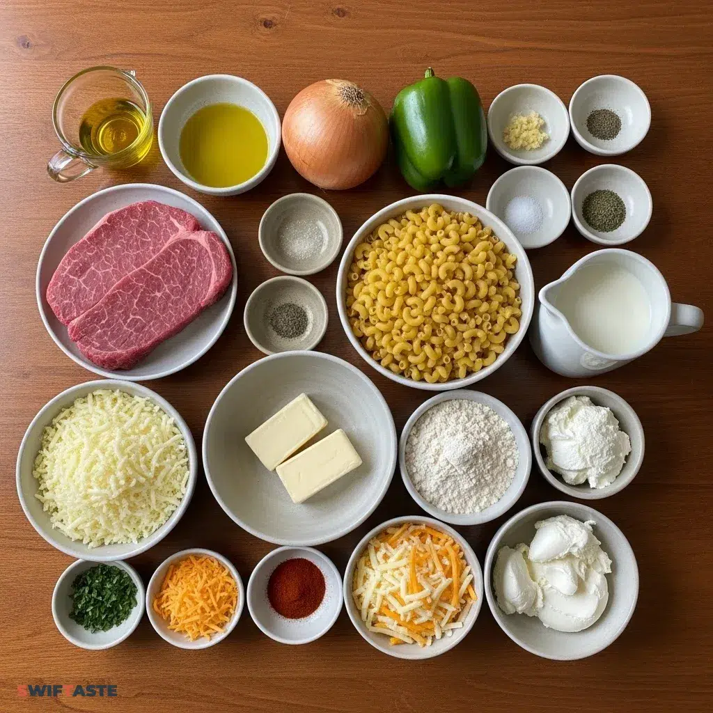 Crafting this incredible High-Protein Philly Cheesesteak Mac & Cheese starts with quality ingredients. Here’s what you need to gather for this quick and delicious meal: